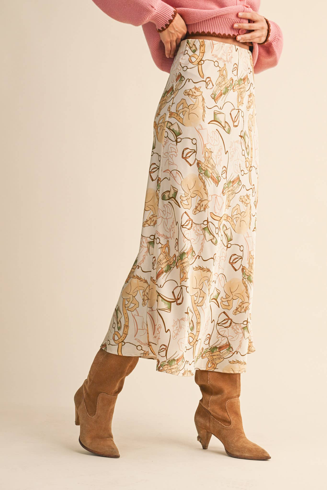 + Satin western print midi slip skirt + &merci exclusive print + Satin effect western print fabric + High waisted fit + Covered elastic waistband + Midi length