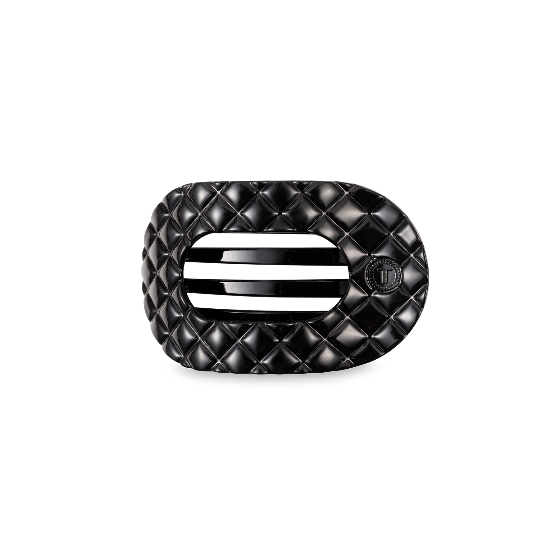 Lay flat and relax with the new TELETIES Jet Black Quilted Small Flat Round Hair Clip in Black. This hair clip is designed to allow you to lay back flat, do yoga, or sit comfortably in a seat with a headrest, and it is made with the same material that is nearly unbreakable. Lay down flat with comfort Bendable teeth for a secure yet gentle hold Lightweight, durable, and suitable for all hair types Perfect for all-day wear—from sunup to sundown The small size is 3.25 inches long.