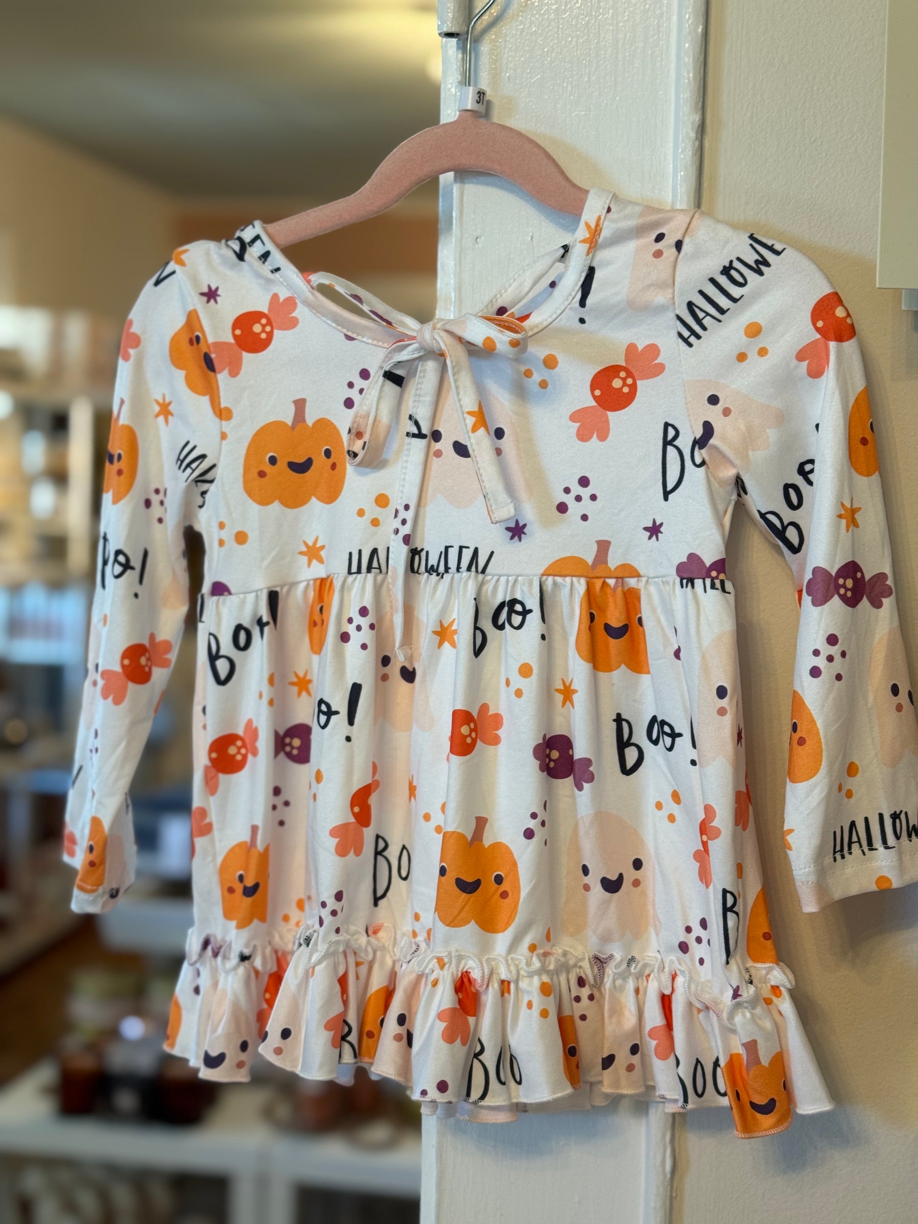Two piece halloween pants and top set. Ruffle bottom top with tie back and orange leggings with print accent on the ankle.