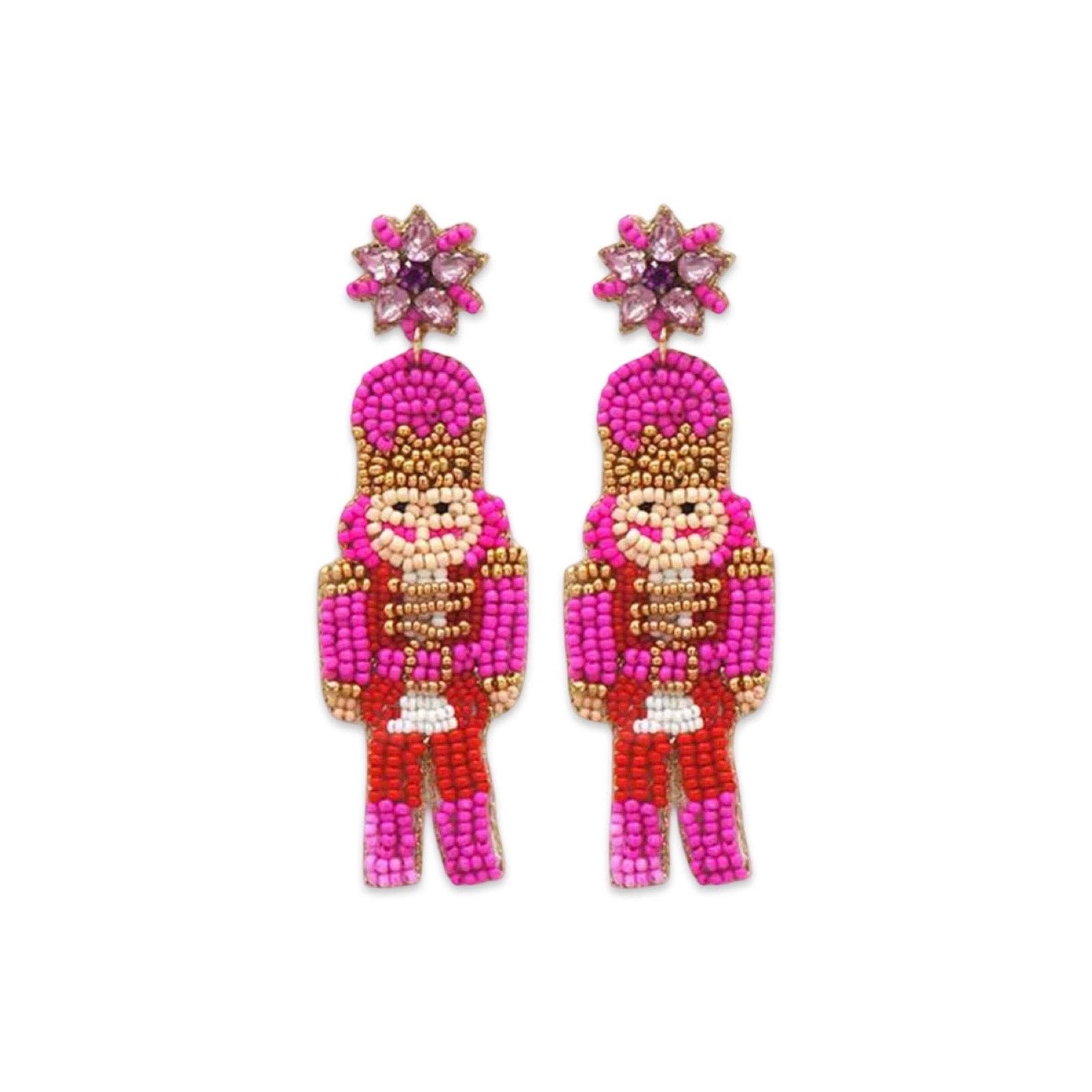 These beaded nutcracker earrings are: -3" diameter -Beaded -Comes in other colors -Made with nickel-free post. Available in green or fuchsia
