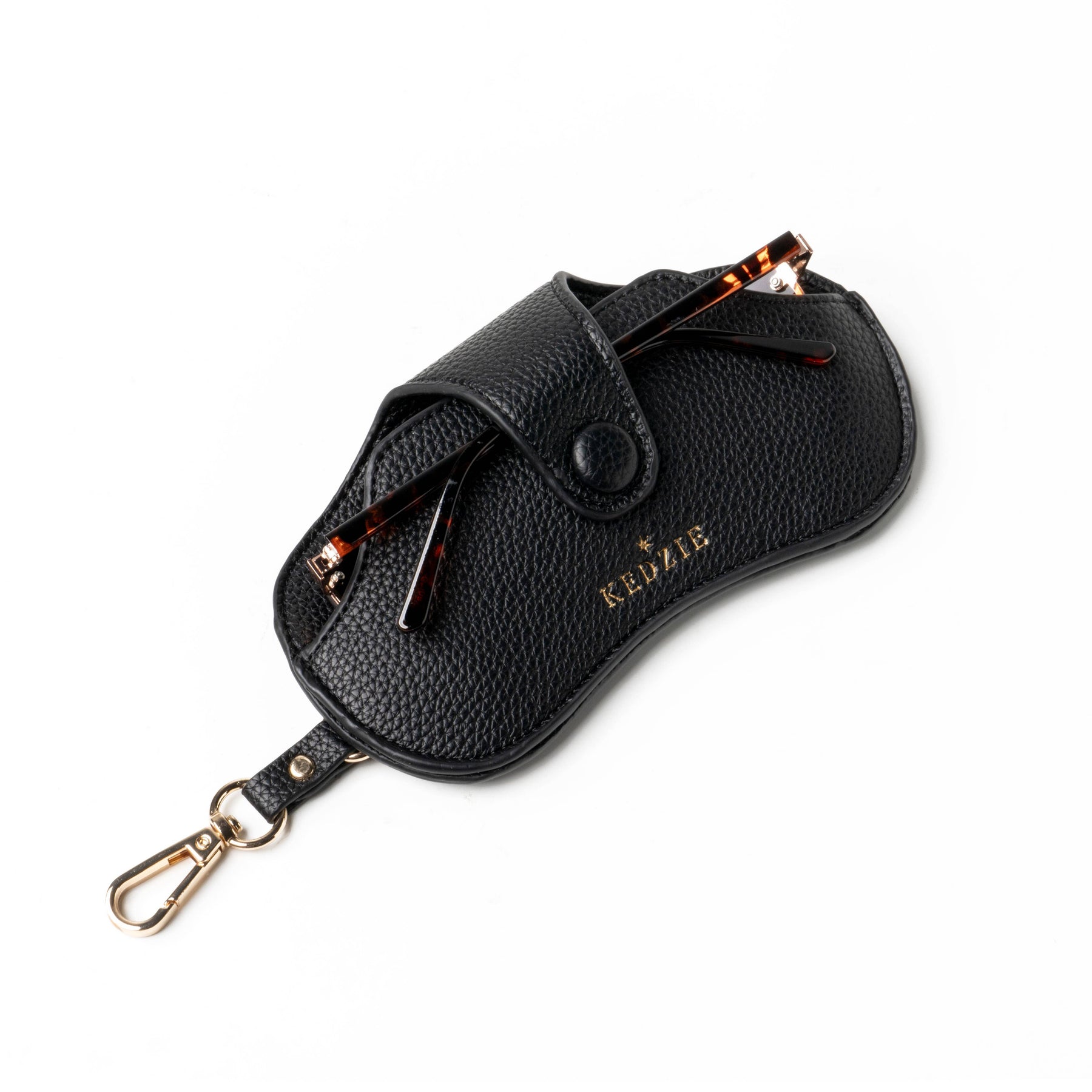 Conveniently accessible storage for glasses, sunnies & blue light blockers! These buttery soft vegan leather cases are perfect for travel, office and everyday. Customers can clip to the outside or inside of any bag to safely store eyewear on the go. Buttery soft vegan leather protects lenses Secure snap closure Universal swivel-snap clip Dimensions: 9” W (including clip) x 3.5” H x 0.25” D