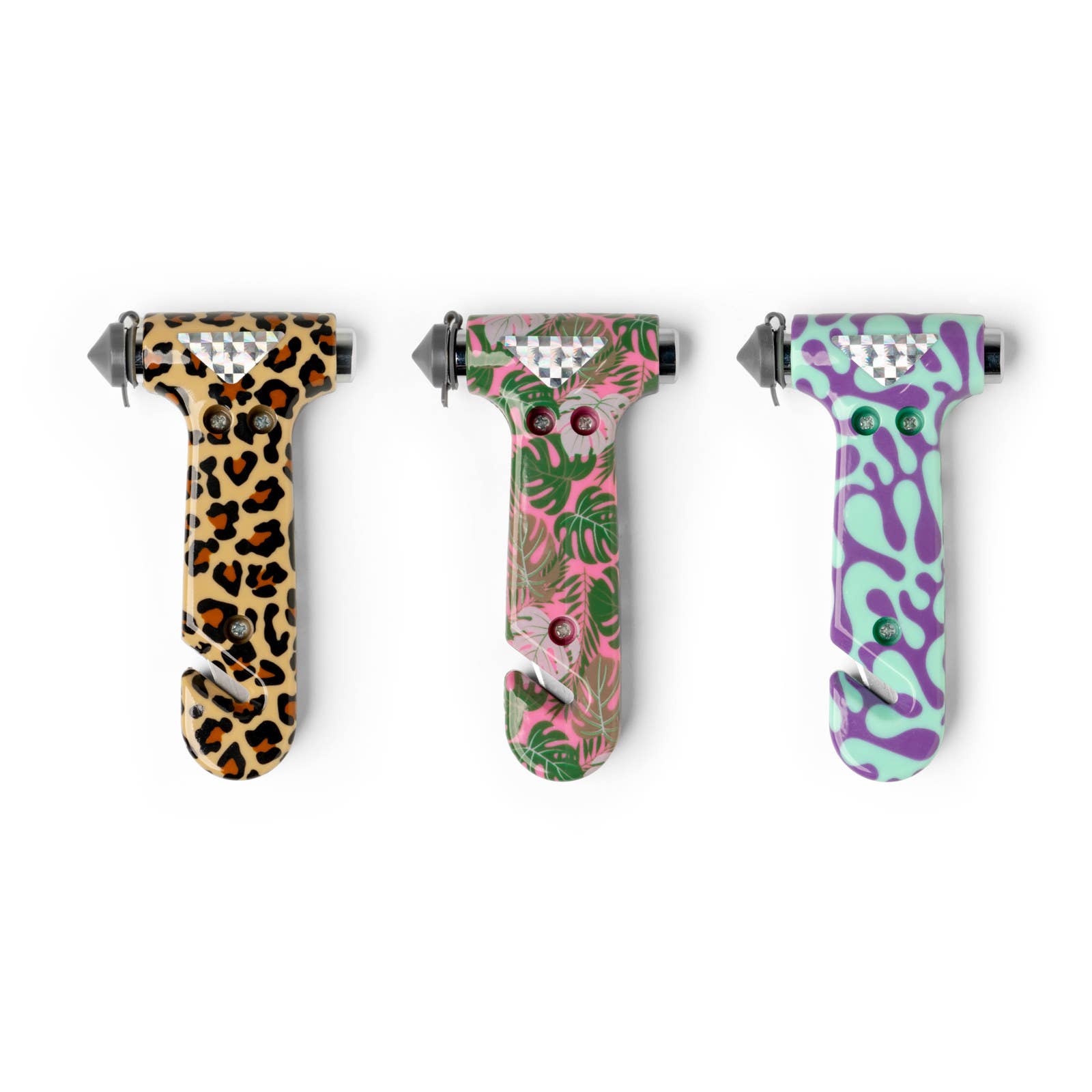 Prints: Abstract, leopard print, tropical leaves Quick Features: Durable carbon steel emergency tool Carbide tip to easily break windows Guarded razor to cut seatbelts Get yourself and others to safety after car accidents or vehicle submersion