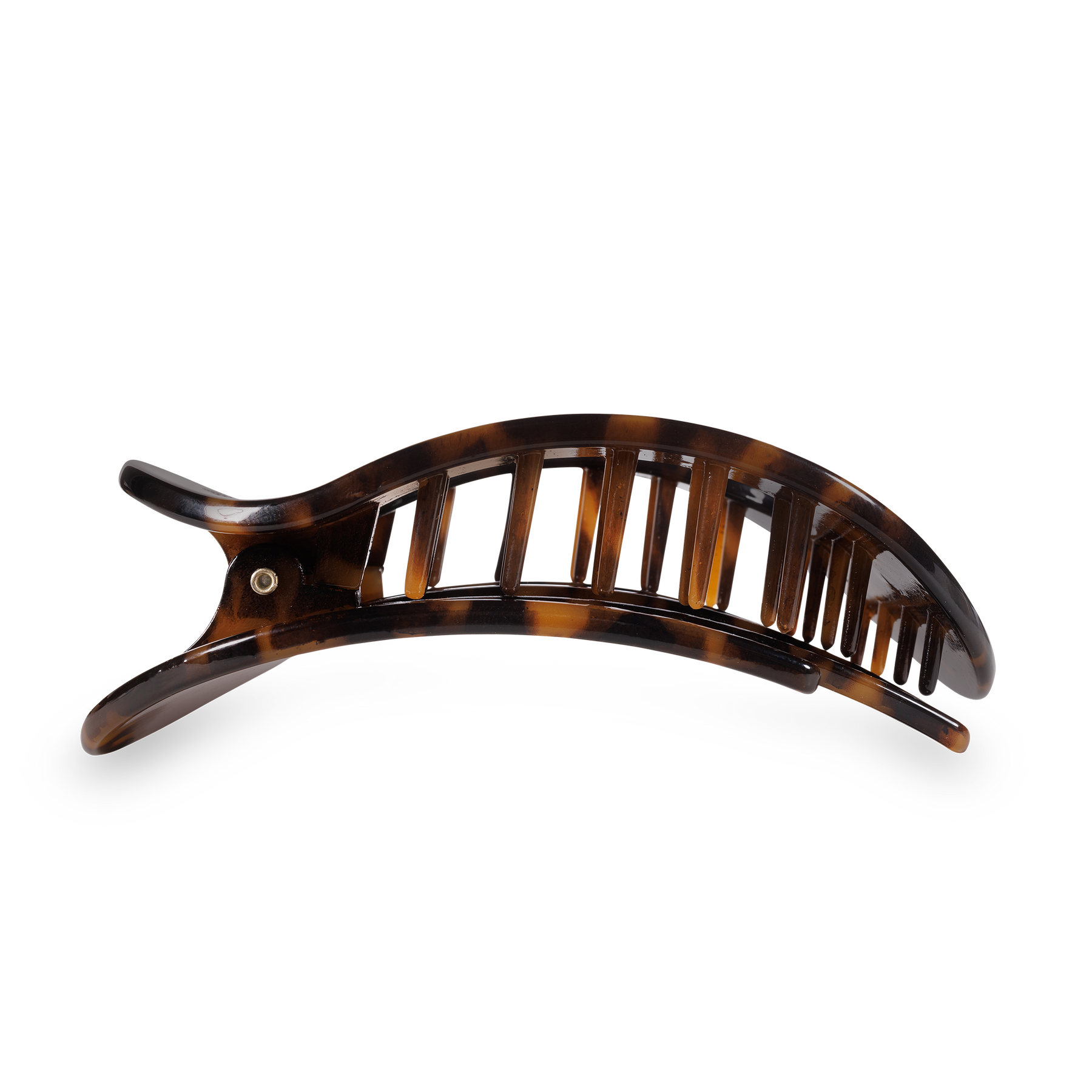 Lay flat and relax with the new TELETIES Tortoise Large Flat Round Hair Clip in Brown. This hair clip is designed to allow you to lay back flat, do yoga, or sit comfortably in a seat with a headrest, and it is made with the same material that is nearly unbreakable.