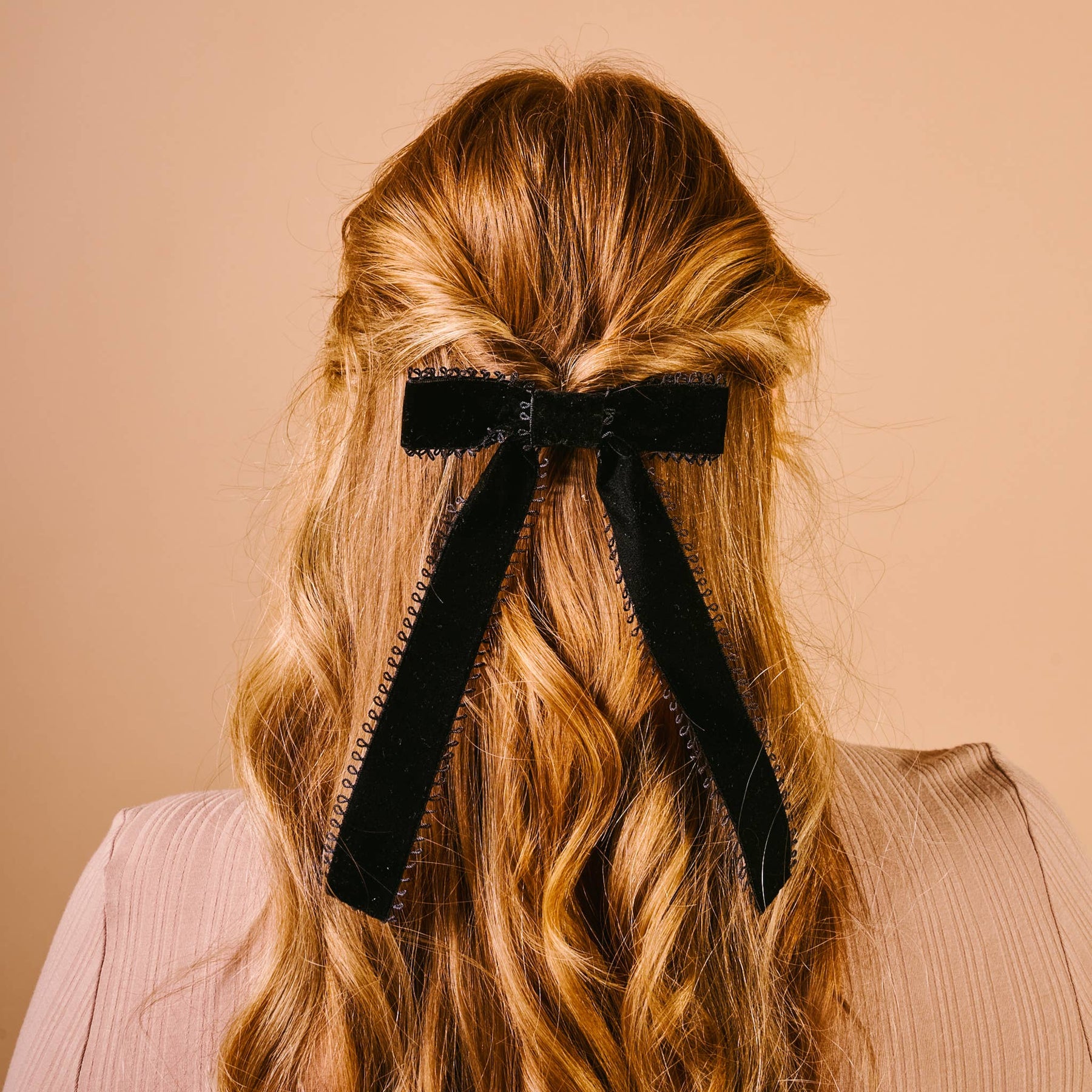 Meet your new go-to: the Vintage Velvet Hair Bow. With its sleek velvet ribbon, dainty looped trim, and classic long-tail silhouette, this timeless piece adds a soft, feminine touch to any look. Delicate yet polished, it clips in effortlessly with a gold alligator clip for a secure hold—perfect for dressing up your everyday or completing a special outfit with a hint of vintage charm. Easy and comfortable fit, secure hold For all hair types and lengths Gold alligator clip closure